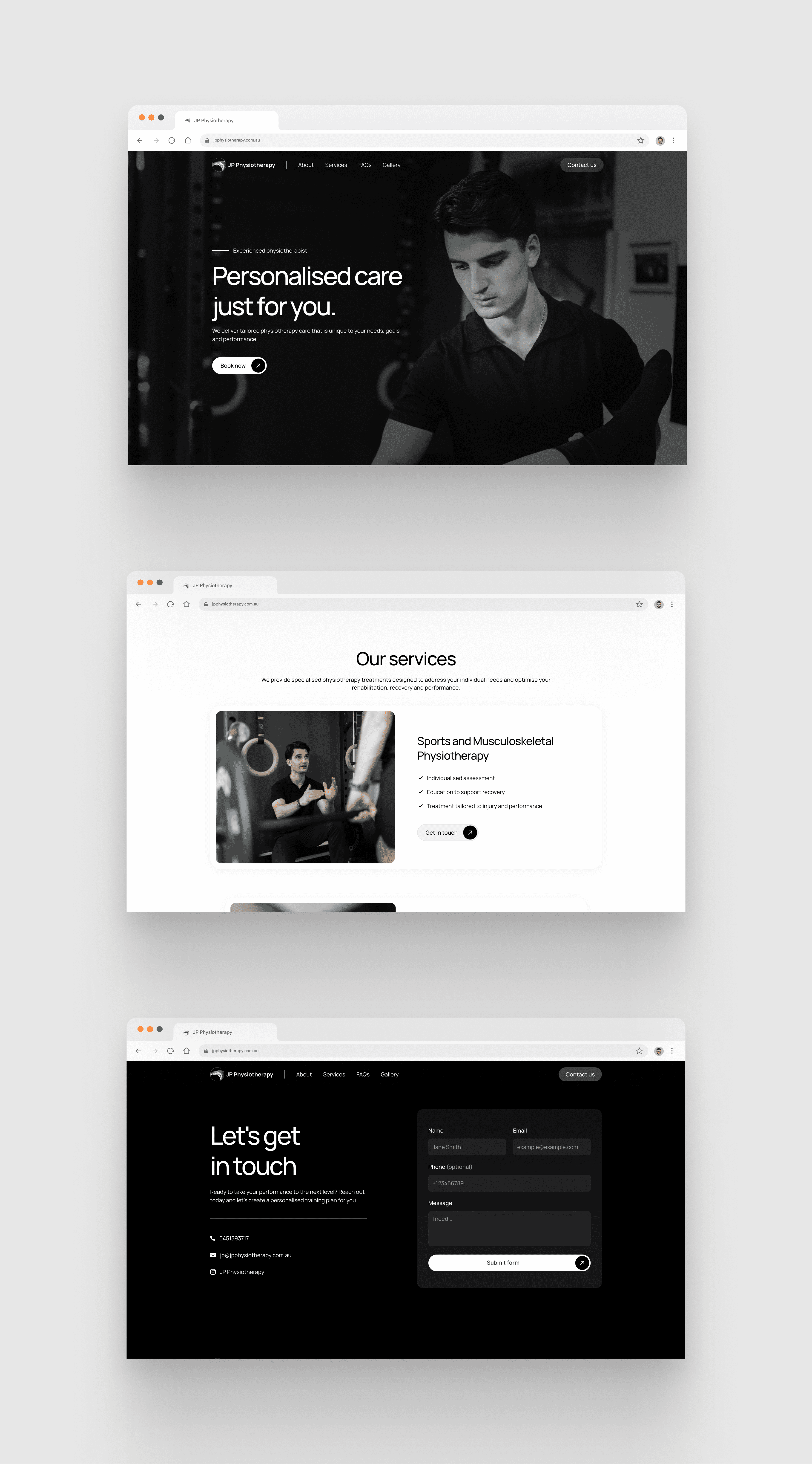 JP Physiotherapy is a website designed for an independent physiotherapist in Adelaide to establish a professional online presence. The site allows potential clients to learn about the service, make bookings, and easily get in touch. I designed and built the website in Framer to create a trustworthy experience that supports the client’s growing practice.